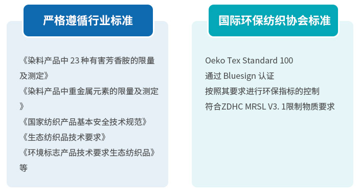 公司嚴(yán)格按照《染料產(chǎn)品中 23 種有害芳香胺的限量及測定》、《染料產(chǎn)品中重金屬元素的限量及測定》、《國家紡織產(chǎn)品基本安全技術(shù)規(guī)范》、《生態(tài)紡織品技術(shù)要求》、《環(huán)境標(biāo)志產(chǎn)品技術(shù)要求生態(tài)紡織品》等標(biāo)準(zhǔn)中涉及染料方面的質(zhì)量要求進(jìn)行產(chǎn)品質(zhì)量控制。另外,為了嚴(yán)把質(zhì)量關(guān)、保持市場競爭優(yōu)勢,公司已通過 Bluesign 認(rèn)證,產(chǎn)品按照其限值要求進(jìn)行環(huán)保指標(biāo)的控制,同時參照執(zhí)行了國際環(huán)保紡織協(xié)會制定的 Oeko Tex Standard 100標(biāo)準(zhǔn)以及ZDHC (有害化學(xué)物質(zhì)零排放聯(lián)盟)標(biāo)準(zhǔn)。
